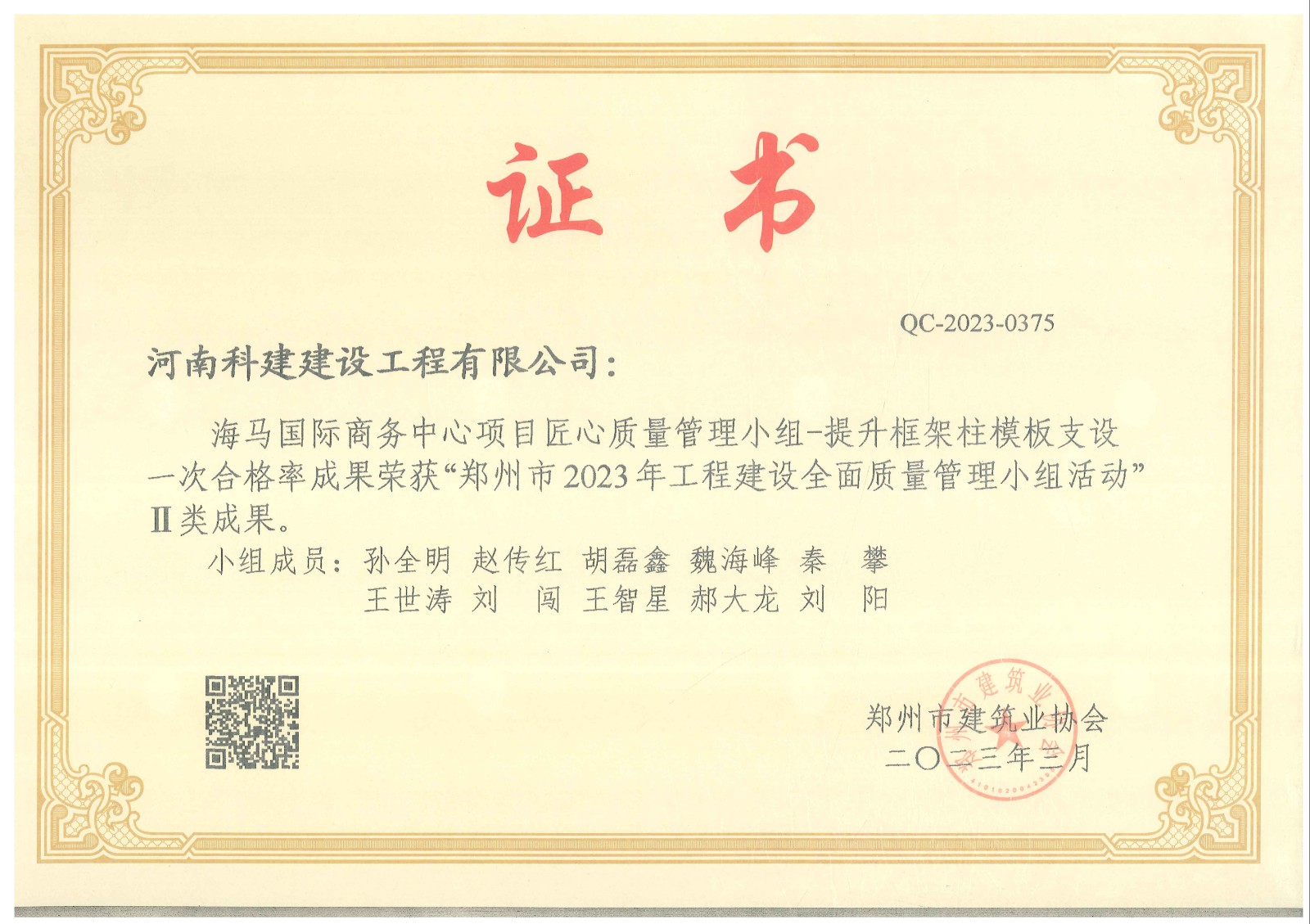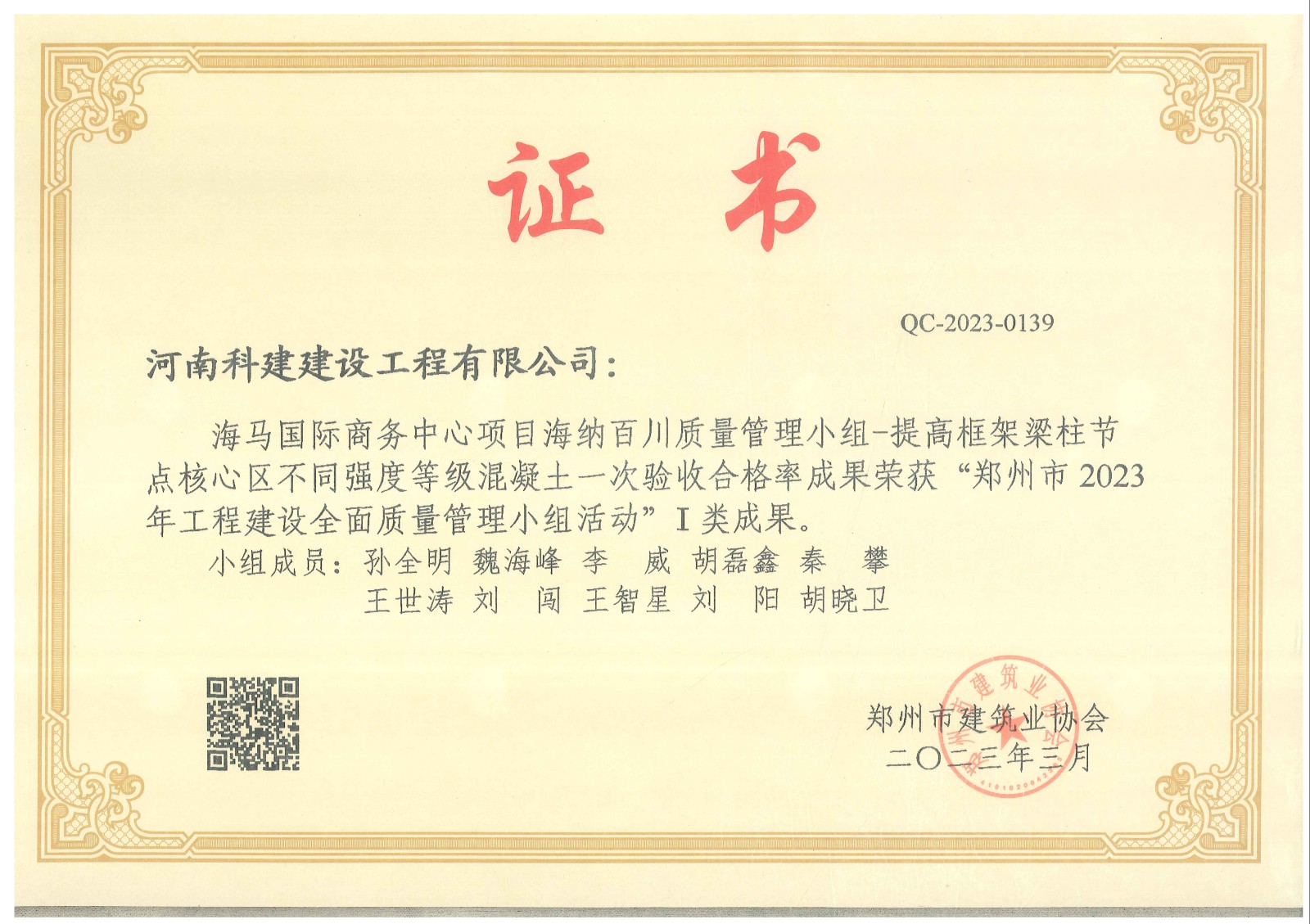 本次QC交流会由郑州市建筑业协会主办,会期共3天。QC成果分为发布和交流两种类型。各建筑施工企业共计参赛成果596项,最终评选出一类成果奖153项,二类成果奖308项,三类成果奖135项。科建公司共有5项QC成果参赛发布,参赛成果分别为:海马国际商务中心项目1项发布成果,成果名称为《提高框架梁柱节点核心区不同强度等级混凝土一次验收合格率》,2项交流成果,成果名称为《提高剪力墙施工质量一次验收合格率》、《提升框架柱模板支设一次合格率》。恒大赵村安置区项目1项发布成果,成果名称为《提高地下车库铝模板施工质量一次合格率》。经开区人才公寓项目1项发布成果,成果名称为《提高二次结构混凝土观感质量一次验收合格率》。本年度我公司及项目申报成果类型均为问题解决型。