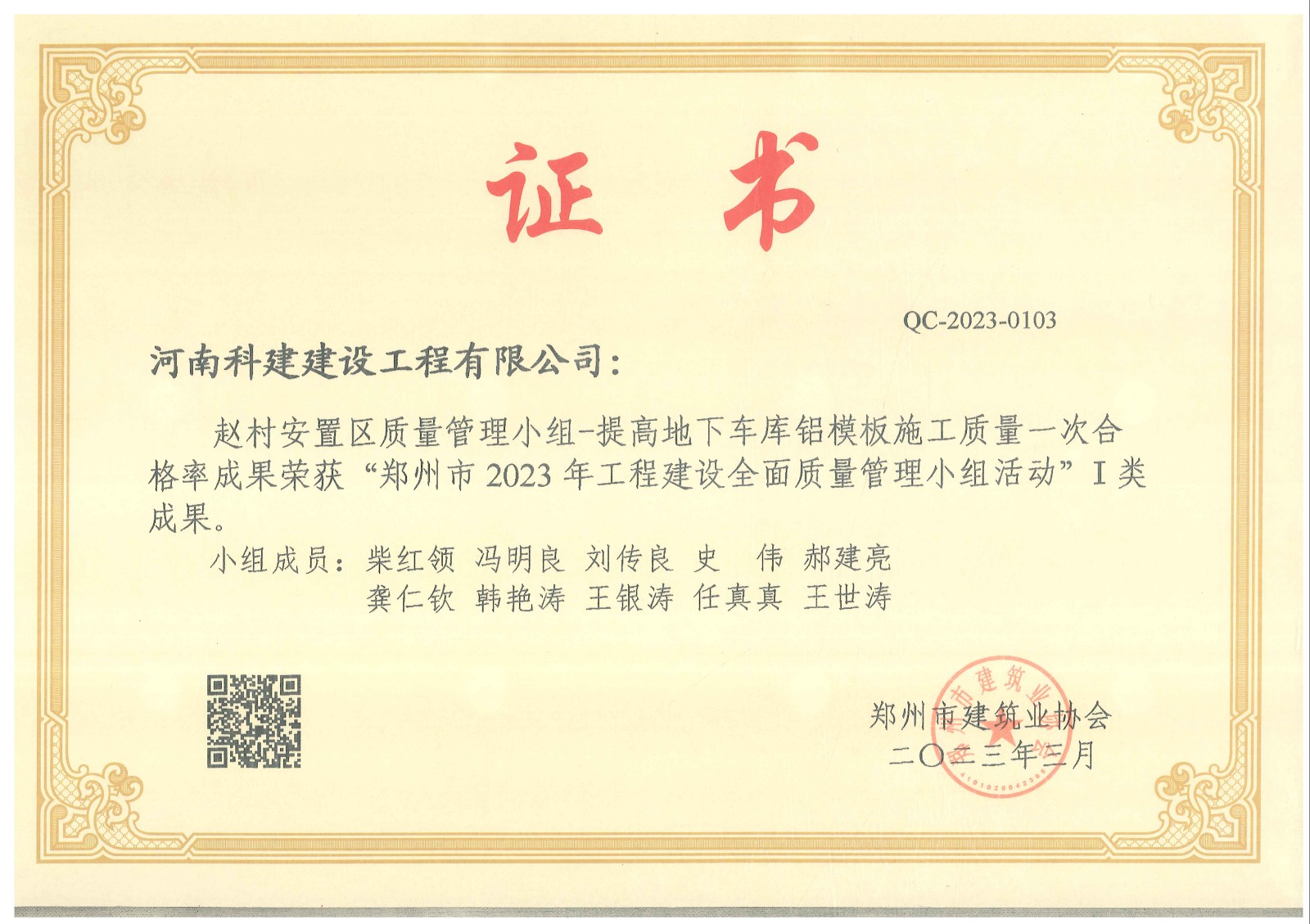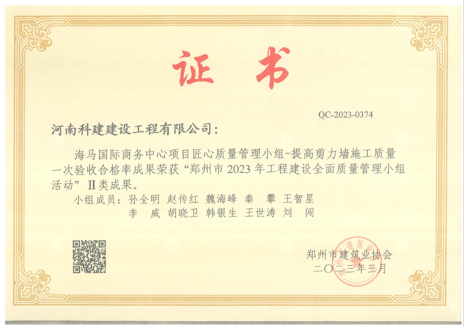 最终我公司海马国际商务中心项目荣获郑州市2023年意昂体育注册建设全面质量管理优秀QC成果一类成果奖1项,二类成果奖2项。恒大赵村安置区项目荣获一类成果奖1项。经开区人才公寓项目项目荣获一类成果奖1项。